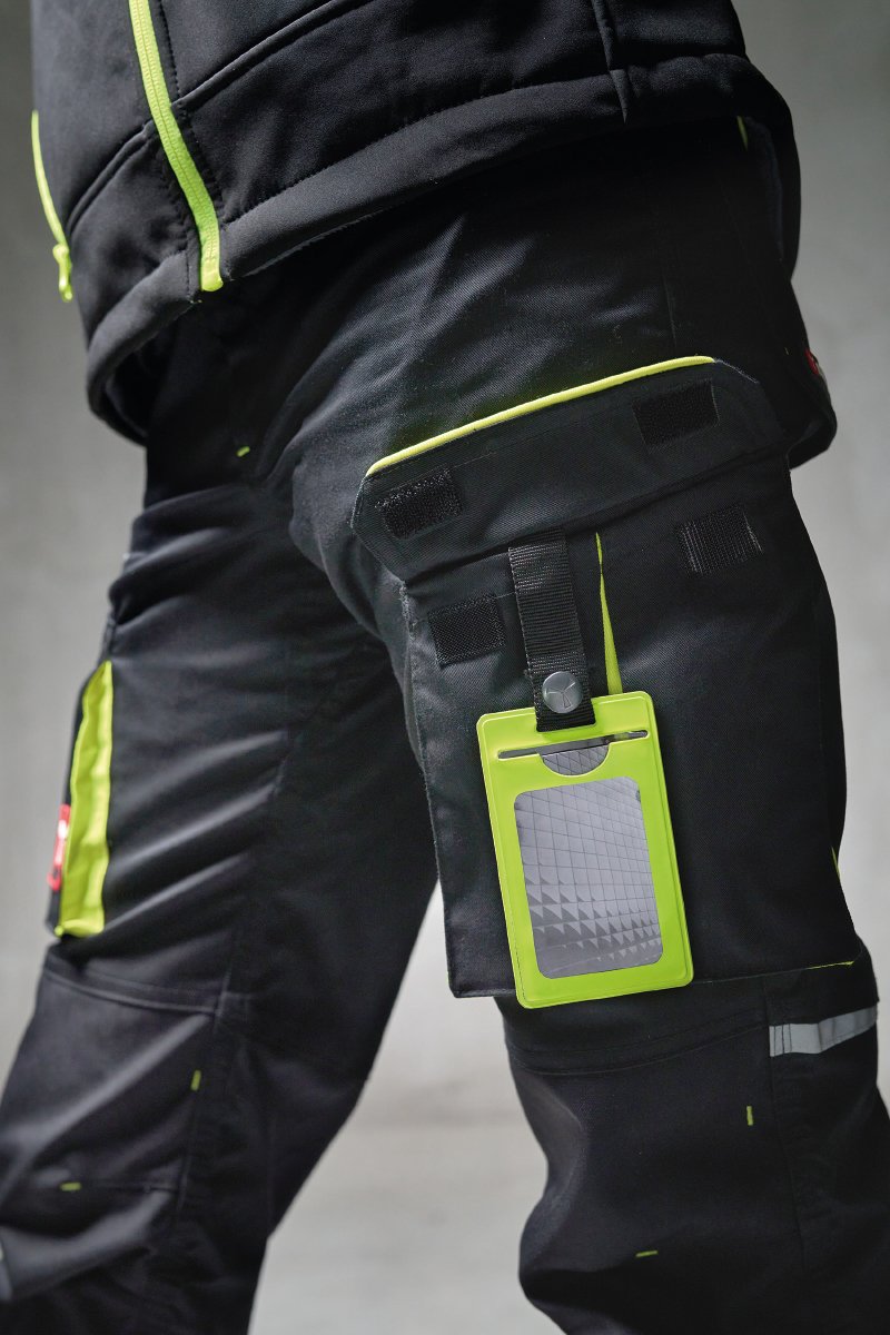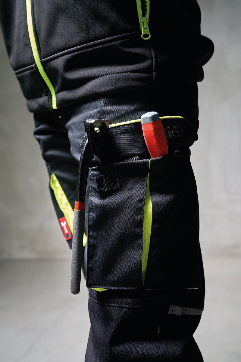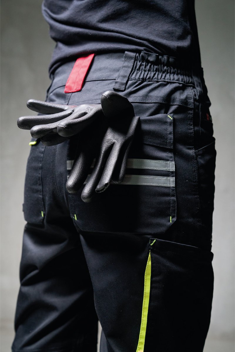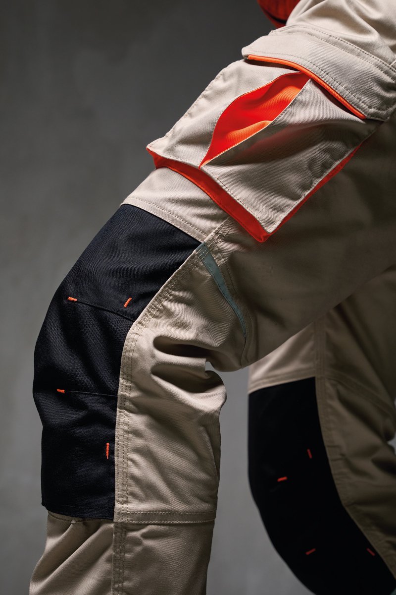 Rückseite: 1 Tasche mit Patte und Klettverschluss, 1 Tasche ohne Patte, aber mit 2 reflektierenden Streifen, 1 Zollstocktasche (rechtes Bein), reflektierende Einsätze auf Kniehöhe (beide Beine), Stoßband in Kontrastfarbe (beide Beine). Außerdem: Dreifachnähte im Schritt, an der Beininnen- und -außenseite, Verstärkungseinsätze in Kontrastfarbe an verschiedenen Stellen.