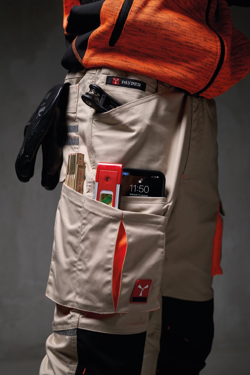 Auf der Vorderseite 2 geformte Taschen, 1 Münztäschchen auf der rechten Seite und 1 Sicherheitstasche mit Reißverschluss auf der linken Seite. Auf der Vorderseite des linken Beins befindet sich 1 Tasche mit Ziehharmonikafalte, Patte mit Klettverschluss und Ausweisfach. Vorderseite des rechten Beins: 1 Handytasche mit reflektierender Paspel und 1 Tasche mit Ziehharmonikafalte. Beide Beine besitzen Kniepolstertaschen aus kontrastfarbigem Nylon Oxford 500D (Öffnung von unten) mit reflektierenden Einsätzen an der Öffnung.