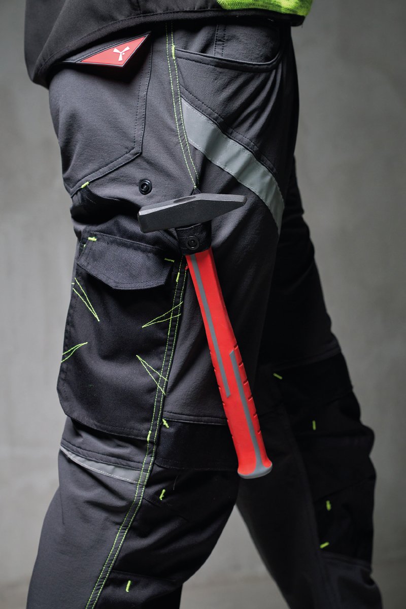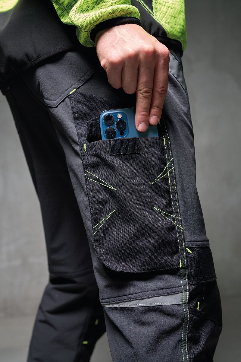 1 Tasche mit Patte und Klettverschluss und 1 Tasche ohne Patte, aber mit 2 reflektierenden Streifen, 1 Hammerschlaufe (rechtes Bein), 1 offene Zollstocktasche (rechtes Bein) und 1 Handytasche mit Patte und Klettverschluss (rechtes Bein), reflektierende Einsätze auf Kniehöhe (beide Beine), Stoßband in Kontrastfarbe (beide Beine).