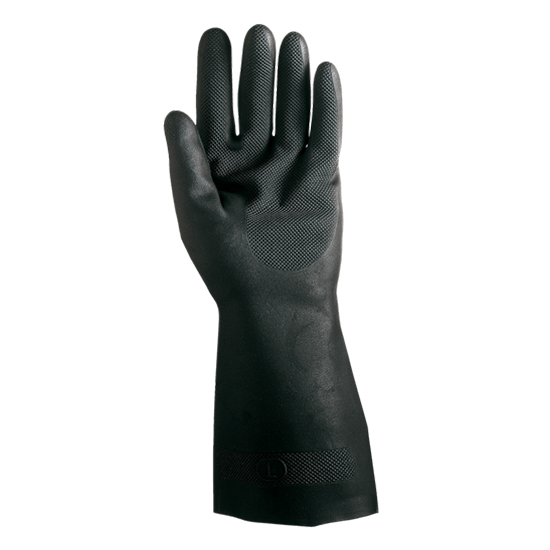 Handschuhe aus Latex- und Neoprenkautschuk, Stärke 0,65 mm, Länge 33 cm. Innen beflockt, Wabenmuster auf der Oberfläche.